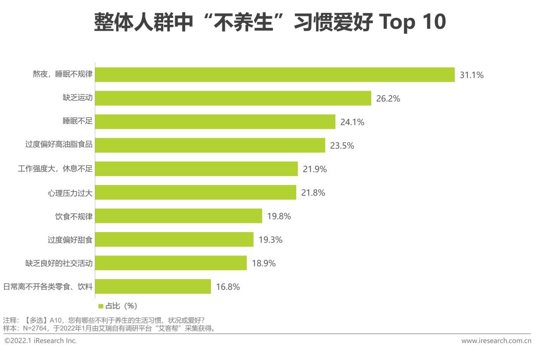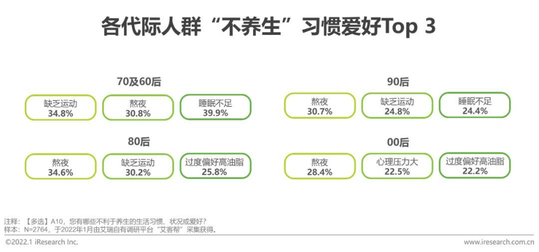 熬夜与睡眠不足几乎是所有代际人群养生路上的头号大敌,其次则是“管不住嘴”和“迈不开腿”。