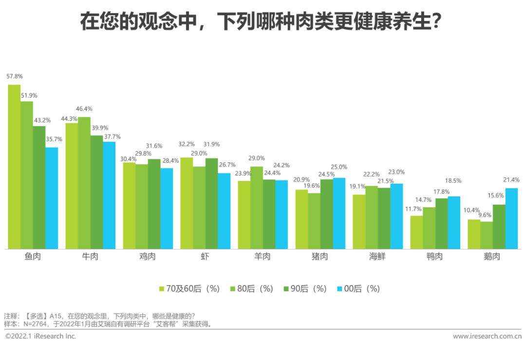 代际间对肉类健康的认同差异略小,主要体现在随着年龄降低,对鹅肉的健康认同显著上升。