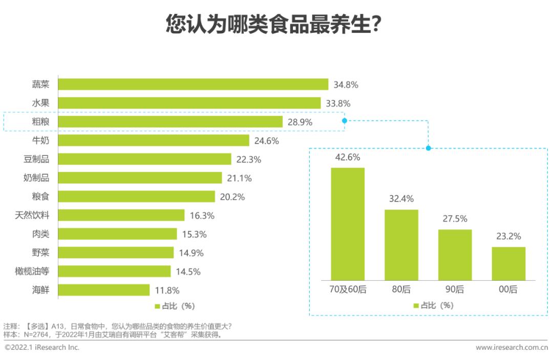 代际群体对食品品类的养生价值看法趋同,水果蔬菜获得一致好评,值得注意的是,高龄代际对粗粮别有青睐。