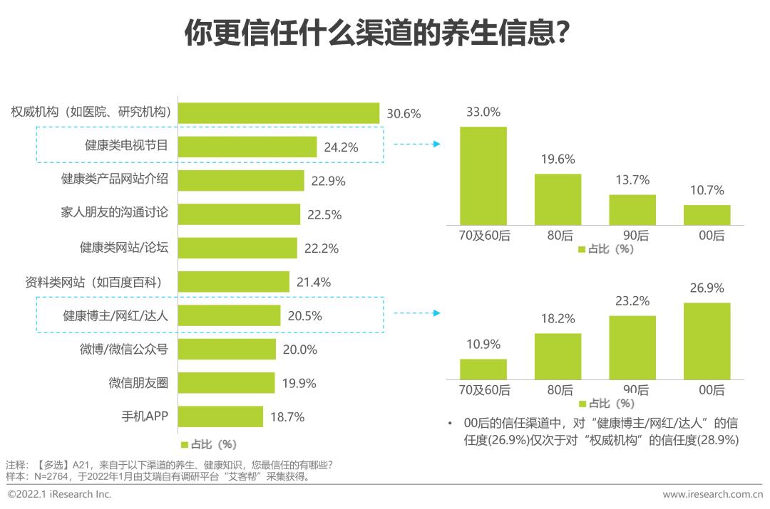 权威机构仍是大家最信任的养生信息来源,但相比高龄代际对电视节目等中心化渠道的偏好,年轻代际则更偏好KOL。