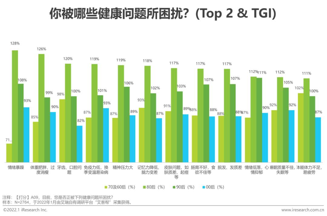 相比高龄代际的年龄压力下的身体不良状况、年轻群体有更多精神、心理方面的健康困扰,如心理压力大、焦虑等,年轻群体也更加重视心理上的健康问题。