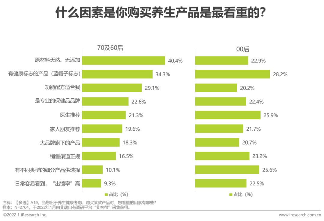 不同代际的养生 消费意愿相似,但侧重点差异显著:高龄代际偏好 “天然”、“绿色”等传统概念,对于养生信息也更信任权威、传统渠道。年轻代际更偏好新的养生概念,甚至会在意养生概念的“网红”属性,喜欢话题性的养生产品,对养生知识和信息来源也更偏好多元、但非权威渠道。