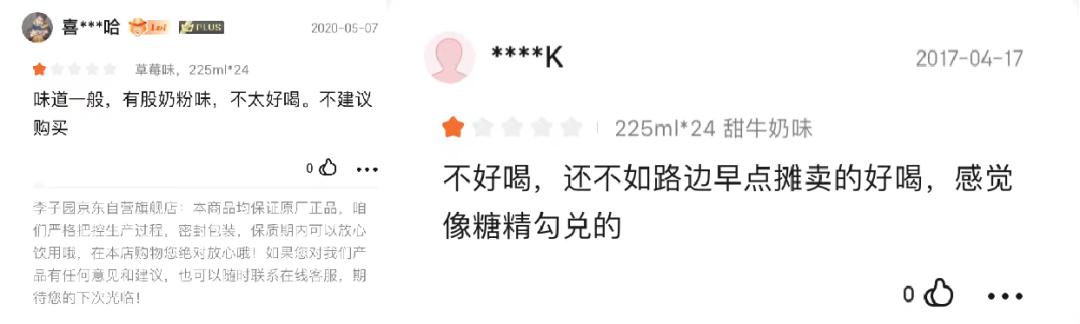 其实,消费者对李子园甜味牛奶饮料早已颇有微词。无论是社交媒体还是电商平台上,均存在部分消费者反馈李子园产品“一股奶粉味”、“像糖精勾兑的”。更有甚者,部分消费者在电商平台评论区反馈产品过期、存在质量问题等。对此,李子园未作重点提及,只是回应公司会与消费者和有关部门进行沟通处理。