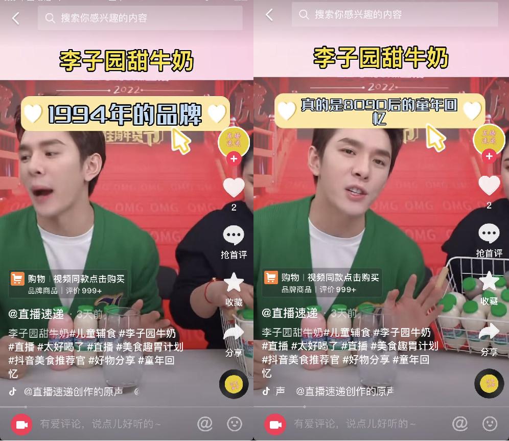 除了电商平台,李子园还不断尝试直播带货、短视频等新传播方式与年轻人群沟通,这也是其做出的一大改变。但从消费者在直播间和短视频的评论看,李子园“新新鲜鲜”的卖点似乎并未在年轻人中获得共鸣,大多数消费者对李子园的认知仍然停留在“童年的记忆”上。