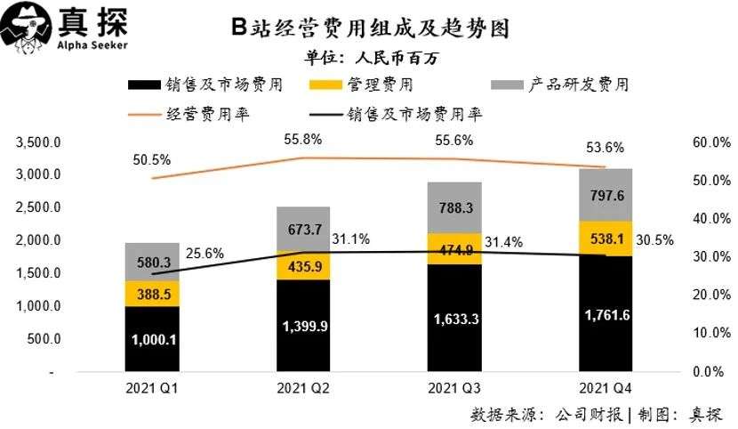 本季度,B站销售及市场费用为17.62亿元,销售及市场费用率达到30.5%,而这也是连续三个季度公司销售及市场费用率超过30%。