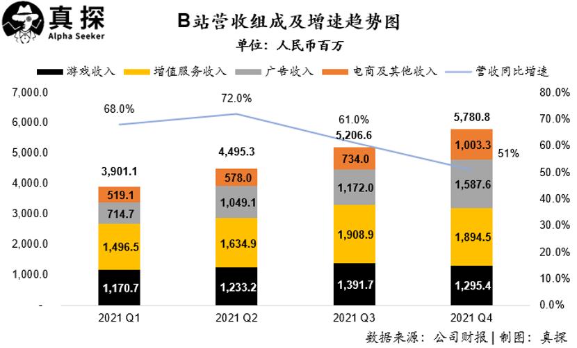 事实上,在目前的市场环境下,B站在本季度已经交出了一份相当不错的业绩。本季度,B站实现营收57.8亿元,同比增长51%;2021年全年实现总营收193.8亿元,同比增长62%,单季度及全年收入同比增长均超过50%,这样的增速在目前整个互联网行业已经是凤毛麟角。