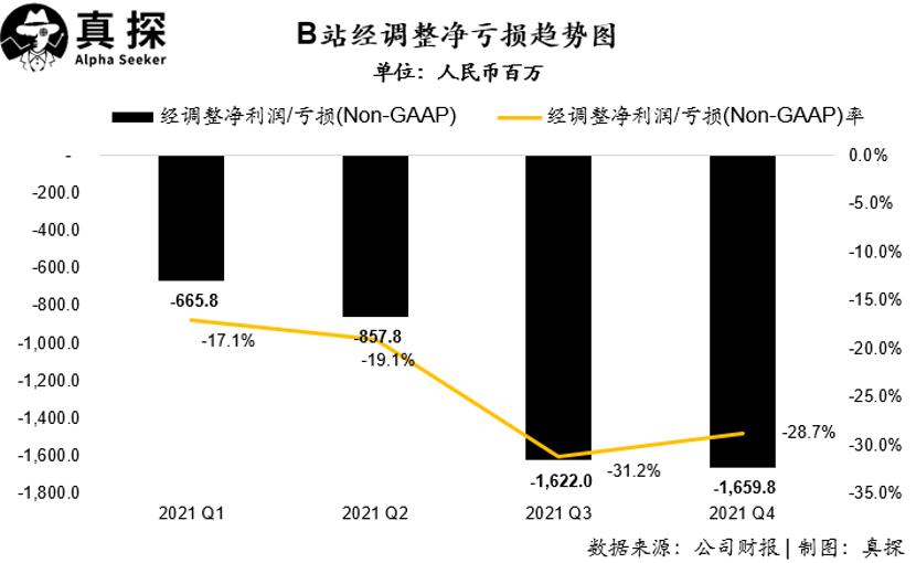 而B站在毛利端的持续降低以及在费用端的持续上升,最终体现到公司层面则是亏损的持续扩大。本季度,B站经调整净亏损为16.6亿元,净亏损率为28.7%。