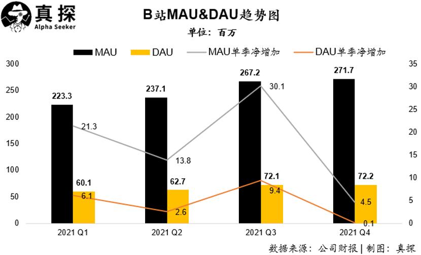 而在用户数据方面,截止2021年四季度,B站平均月活用户(MAUs)数为2.72亿,同比增长35%;平均日活用户(DAUs)数为7220万,同比增长34%,增速均超过30%。