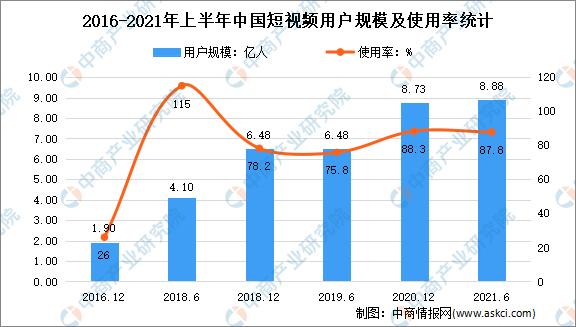 根据中商产业研究院的统计,短视频行业在经历2019年短暂的蛰伏后,疫情期间用户继续暴涨,截止2021年6月,用户规模已经达到8.88亿。