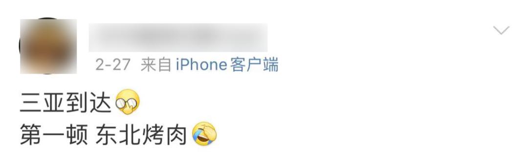 “落地三亚跟着排行榜选当地美食,于是第一顿饭吃了东北烤肉。”