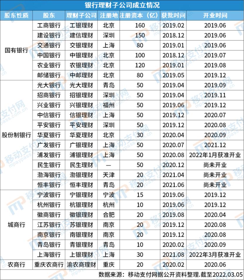 截至2022年3月5日,银行理财子公司成立情况;图片来源:移动支付网
