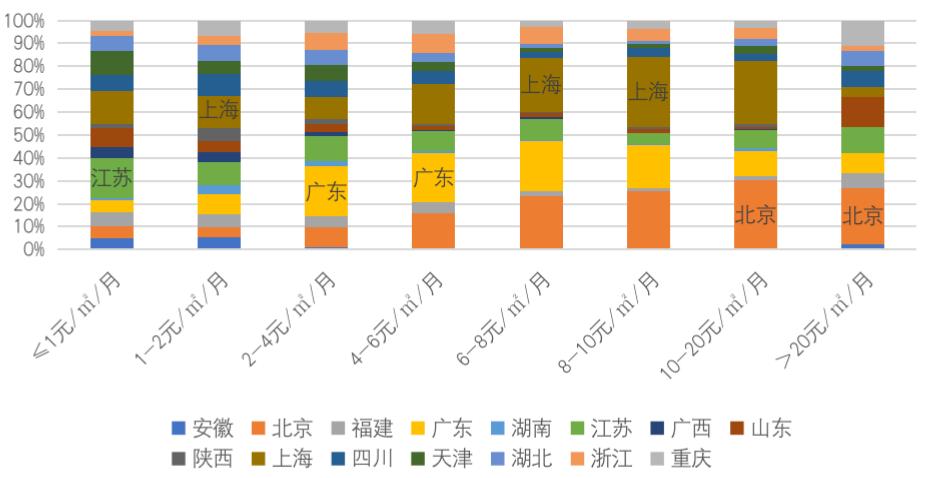 与此同时,由于上海、北京等一线城市经济发展水平高,居民物业费接受度、接受能力高,6元/㎡/月以上的各价格段的最高占比均被上海、北京包揽,且价格段越高,上海、北京等一线城市占比越高。