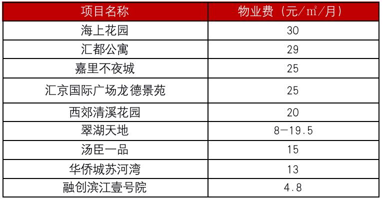 以上海为例,在传统认知中,翠湖天地、汤臣一品、华侨城苏河湾、融创滨江壹号院等项目均是上海高端住宅,但其物业费均不超过20元/㎡/月。