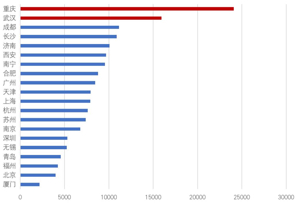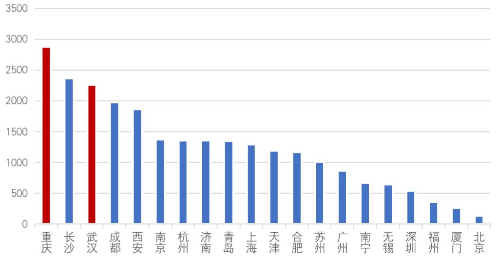 从近一年住宅用地成交规模来看,重庆、长沙、武汉、成都等中西部城市表现依然强劲,重庆成交规模2877万平方米居首位。随着项目的建设交付,我们相信,这些项目将在未来一年转化为该城市企业的重点拓展对象。