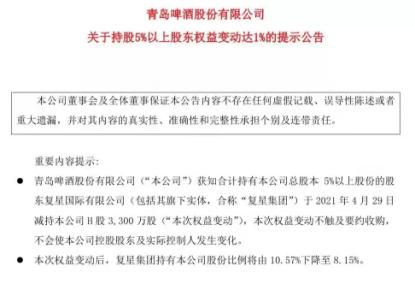 奇偶派从青岛啤酒的公告中发现,从2020年开始复星系开始减持青岛啤酒,复星系通过集中竞价和大宗交易的方式,合计减持青岛啤酒H股股份6790.2万股。最新一次减持发生在2021年4月29日,当日复星系减持青岛啤酒H股3300万股,之后其持有青岛啤酒股份比例由10.57%下降至8.15%。