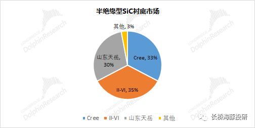 1)半绝缘型衬底市场:半绝缘型衬底主要用于微波射频、光电和中低压功率半导体等领域,主要是通过覆盖氮化镓外延涂层,再进行器件制造。在半绝缘型SiC衬底市场,主要由3个厂商构成了9成多的市场份额。但主要市场上仍以美国公司为主,Cree(现Wolfspeed)和II-VI两家美国公司占据了70%以上的市场。