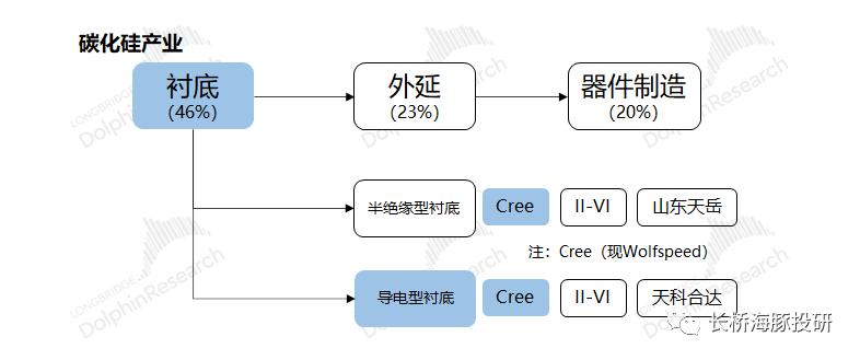 在特斯拉Model 3中能直接看到的是最终的产品碳化硅(SiC)器件,而其具体生产还要经历衬底、外延等生产环节,其中最为核心也是价值量最高的环节就是衬底。衬底是在碳化硅器件的成本中占比接近50%,并且衬底的好坏也直接影响外延环节和最终产品的性能。海豚君认为对碳化硅产业链的研究,最核心的部分是衬底。