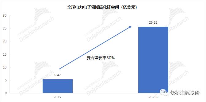 在特斯拉Model 3搭载SiC逆变器后,其余各大车厂也纷纷跟进对碳化硅(SiC)领域进行布局。据Yole预测,在全球电力电子领域中碳化硅(SiC)的市场空间有望从2019年的5.42亿美元,成长至2025年的25.62亿美元。在此期间高达30%的年均复合增长率,也赋予了碳化硅(SiC)赛道的高成长的预期。