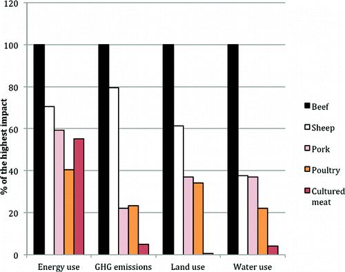 细胞培养肉技术与传统养殖生产肉类方法资源使用的对比,来源:Environmental Impacts of Cultured Meat Production