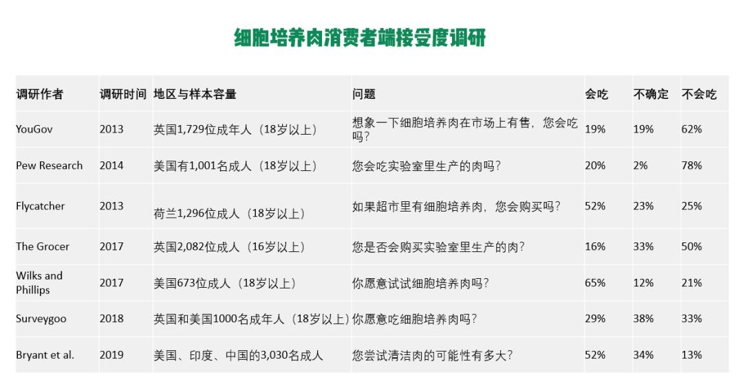 在翻阅了十数个关于细胞人造肉接受度的消费者调研后,我们得出了以下几点消费者市场观察: