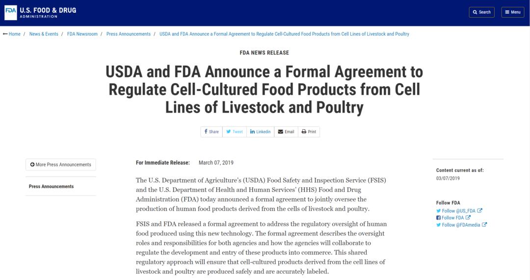 2019年3月,FDA与USDA宣布双方共同监管美国的细胞培养肉行业,来源:USFD