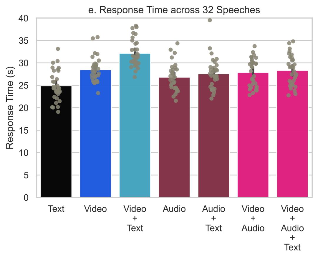 受试者反应时间的中位数是24秒,比视频的平均长度长3秒。无声的、有字幕的视频的反应时间中位数是31秒,比其他所有模式条件的反应时间略长。