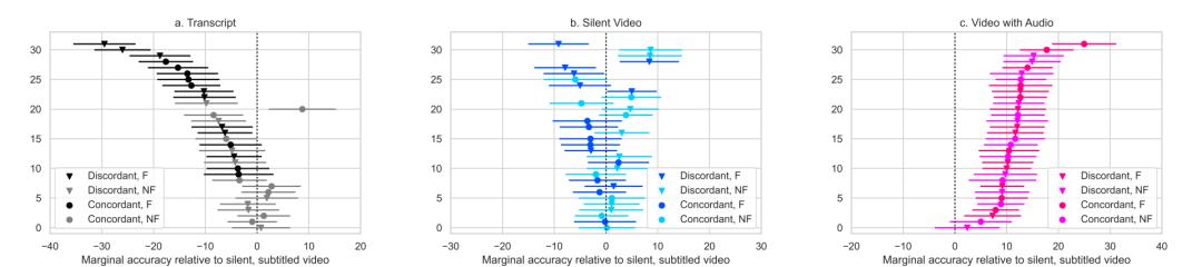 受试者对32个演讲中的每个演讲的文字记录、无声视频和有声视频判断的准确性