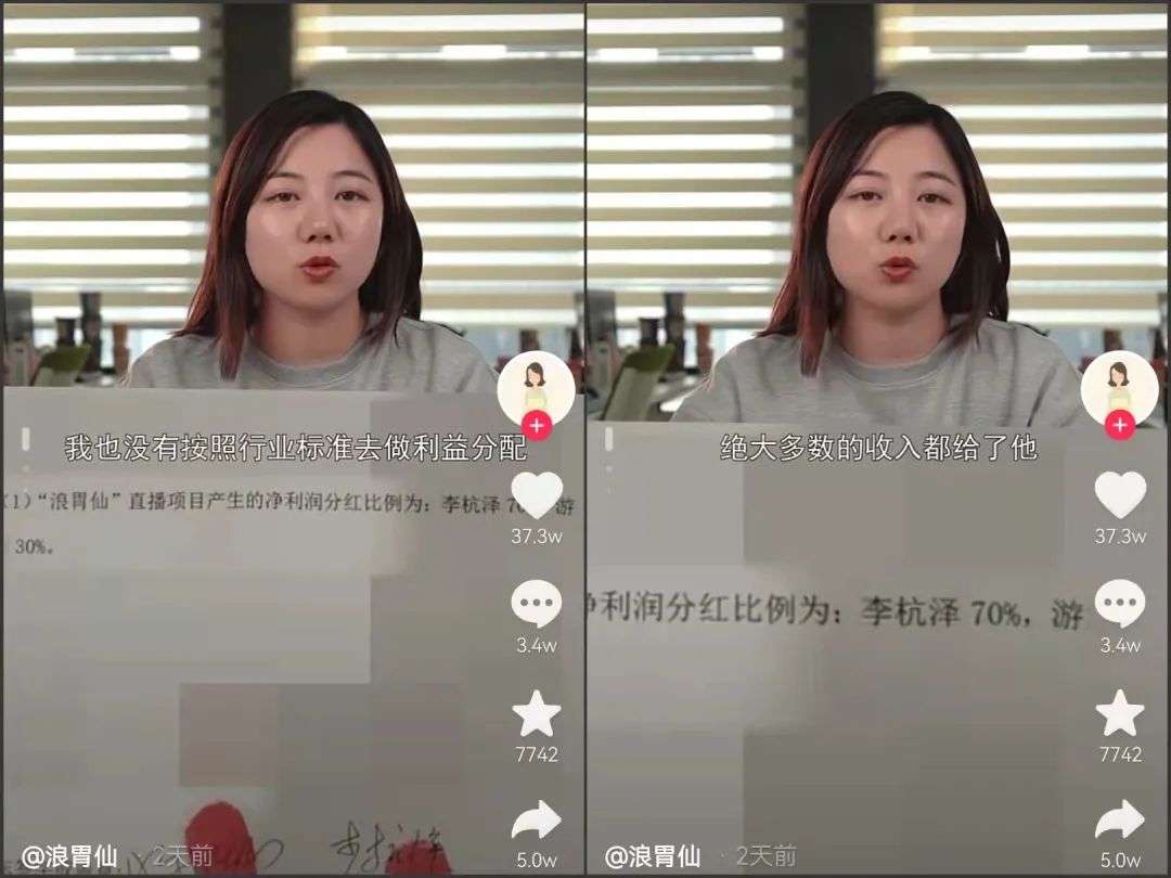 在游絮的声明中,她与@浪胃仙李杭泽结识于2018年,并很快签约为公司艺人。浪老师惊人的食量与自然、接地气的风格很快让他在众多吃播中占据一席之地,半年时间,他在抖音就完成了从20W粉丝到1925W的飞跃。因为吃播辛苦,他们的利润分成为李杭泽70%、公司30%。