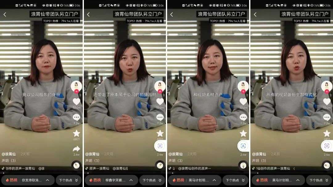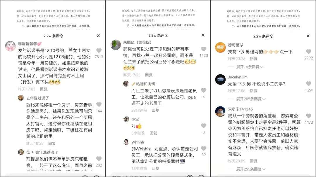 3月6日,游絮在账号“浪胃仙”中连发三则声明,指出李杭泽与前直播运营负责人兰昊的“背叛”蓄谋已久:任职期间,兰昊就已成立了公司“比较开心(杭州)信息技术服务有限公司”,将属于原公司的商业机会悄悄转移到她的新公司中,并以股东的身份带走了原本属于公司的拍摄器材和视频素材资产,甚至将电脑中的视频备份格式化;曾表示过不会雇佣老员工的兰昊,在公司赔付解约后,将他们再次“挖”到新公司。