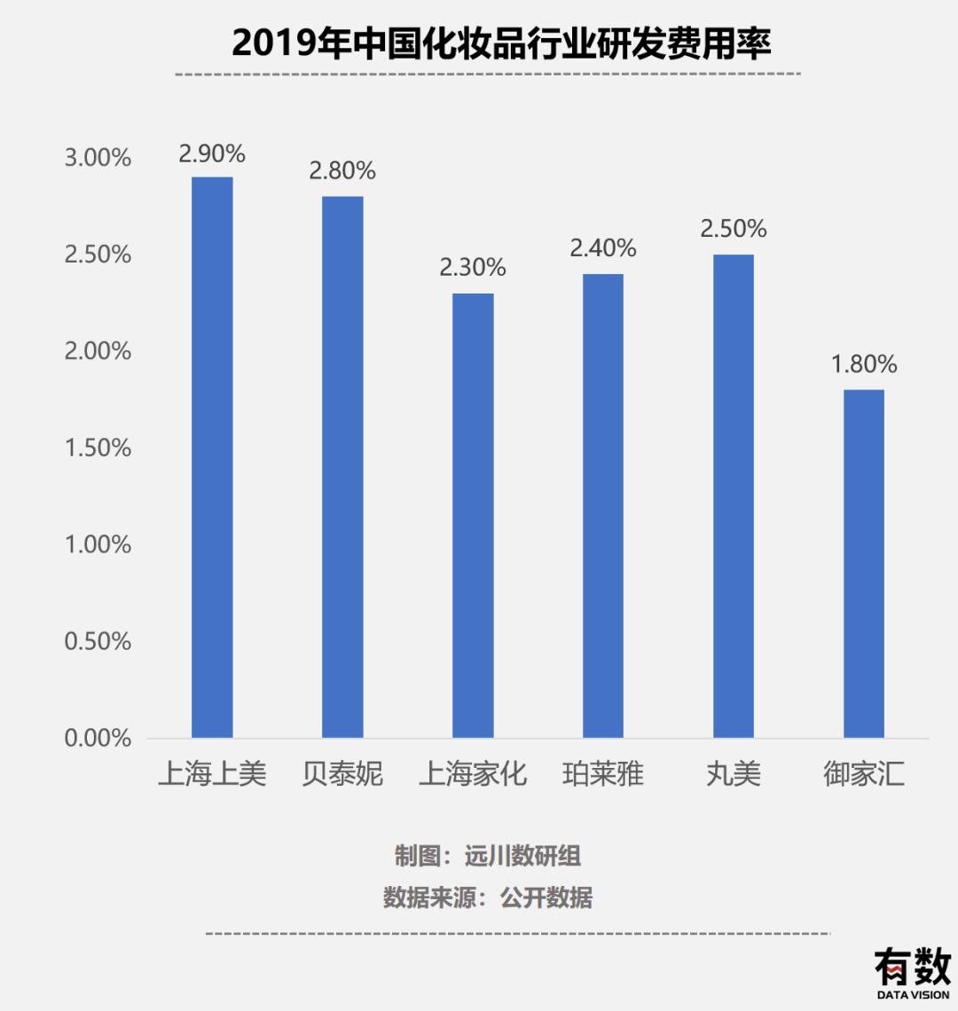 研发费用率确实不高,但并不是唯独上美一家如此,而是行业的通病。化妆品行业的研发费用率通常在2.0%到3.5%,上美的研发费用率在国内同业品牌中基本属于中上之姿,19年甚至领先同行。