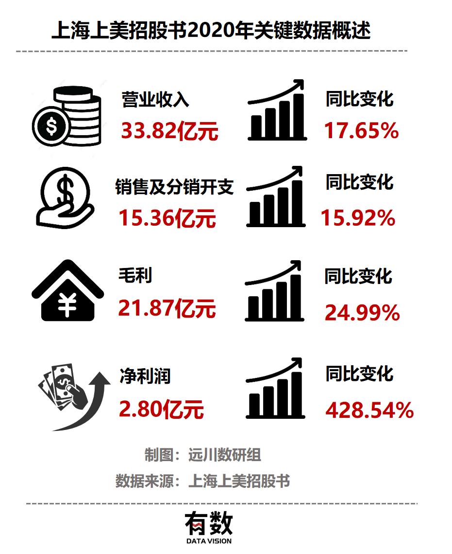上海上美19年实现收益27.74亿元,20年为33.81亿元,毛利率分别为60.9%和64.7%。净利润从0.53亿增长到2.8亿,增幅高达428%。究其根本,还是销售和管理效率的显著提升。