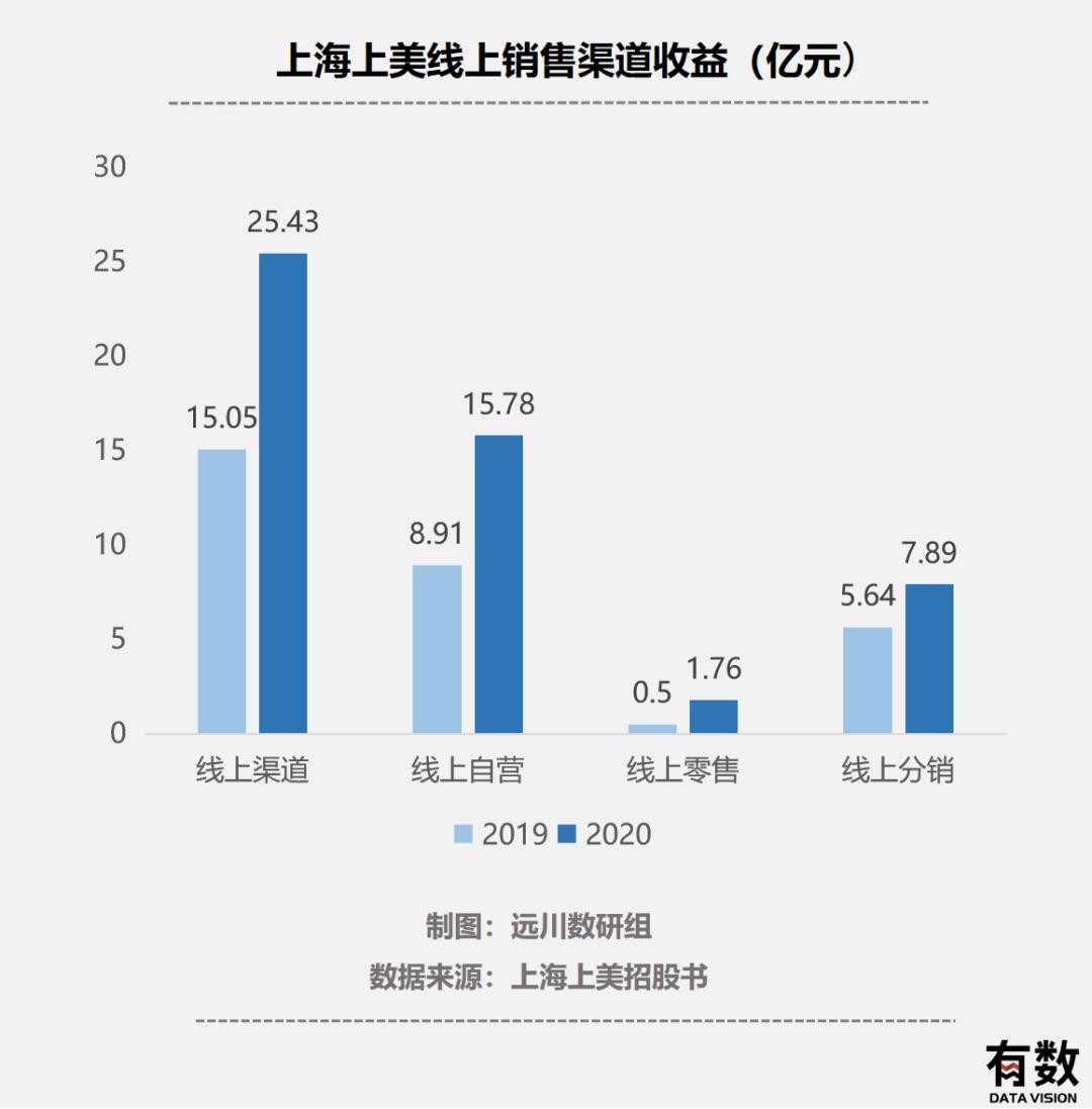 从招股书中也能看到转变趋势,线下渠道收益和占比都砍半,线上渠道增长迅猛。19年到20年,上美的线上渠道营收从15亿增加至25亿,而线下渠道从13亿降至7亿。