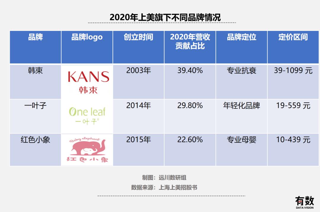 上美能有今天的品牌认知度,功劳主要在旗下三大品牌:韩束,一叶子和红色小象。三大品牌合计营收贡献超过90%。