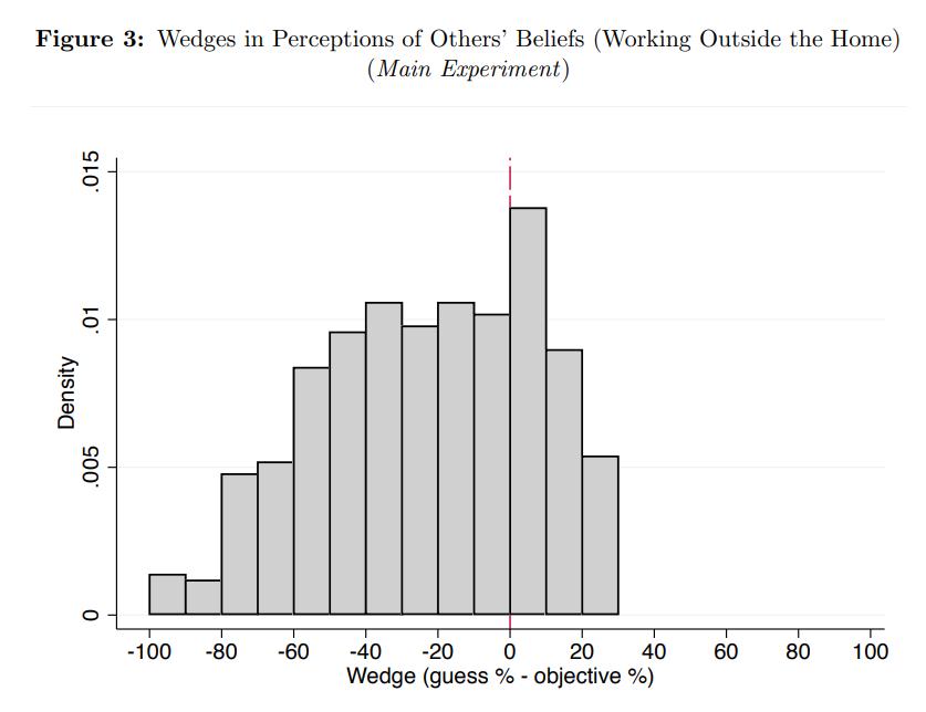 2018年,在调查了500名18-35岁来自不同社区的男性后,研究者发现,他们中有87%的人都支持“女性应当被允许外出工作”,但平均来说他们认为只有63%的同期参与者同意这一点,72%的人都低估了周围人对这件事的支持比例。