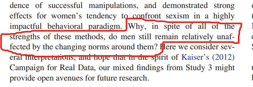 只有在看到有人站出来后,同盟行为才会显著增加,被试的犹豫才会显著减少,而且这种改变主要显示在女性被试身上。无论是给予信息还是给出行为榜样,男性的同盟行为都没有显著增加,连作者都在论文里大喊“Why”。