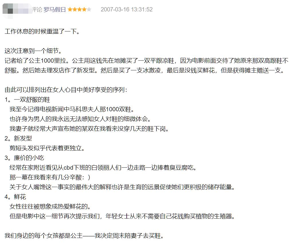 一方面,社会在急速发展,性别平等意识近年来得到了广泛普及,像下面这篇《罗马假日》的影评,2007年刚发出来的时候大多评论在夸“好丈夫”,在最近几年就已经是开怼的远多于赞同的了: