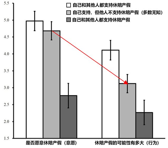 结果发现,参与者实际态度均分是4.22分,偏向于轻微支持,而他们认为同龄人对休陪产假的态度均分是3.16分,偏向于轻微反对。