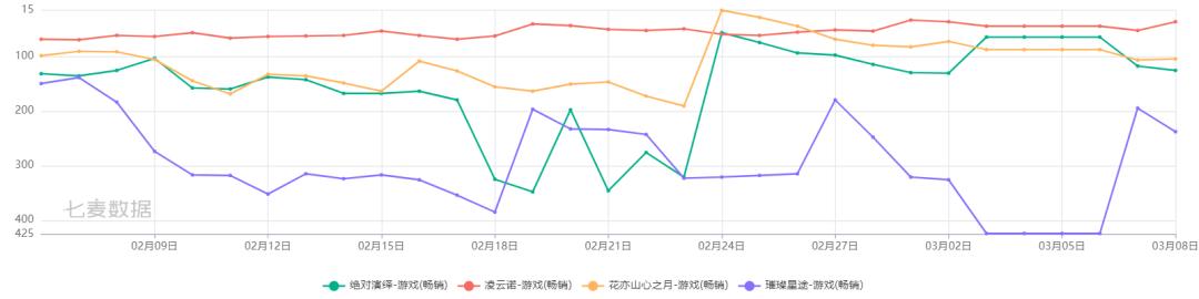 好在近期发布红烛之变主题后,让该作排名迅速窜升,整体成绩相对稳定。相较于上述两款产品,《绝对演绎》及《璀璨星途》的表现相对惨淡,目前《璀璨星途》排名已跌出200名开外。