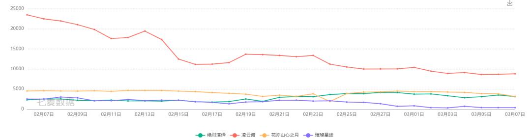 从下载量来看,《凌云诺》与《花亦山心之月》在上线后仍保持稳定的下载量。《凌云诺》近一个月日均下载量维持在13000左右,可谓是一超多强。《花亦山心之月》上线之初下载量突破19万,后续成绩相对稳定,目前日均下载量则保持在4000。《绝对演绎》及《璀璨星途》则是高开低走,日均维持在2000左右。相对其它产品而言,《璀璨星途》成绩十分困窘,近一周日均下载量已跌至470。