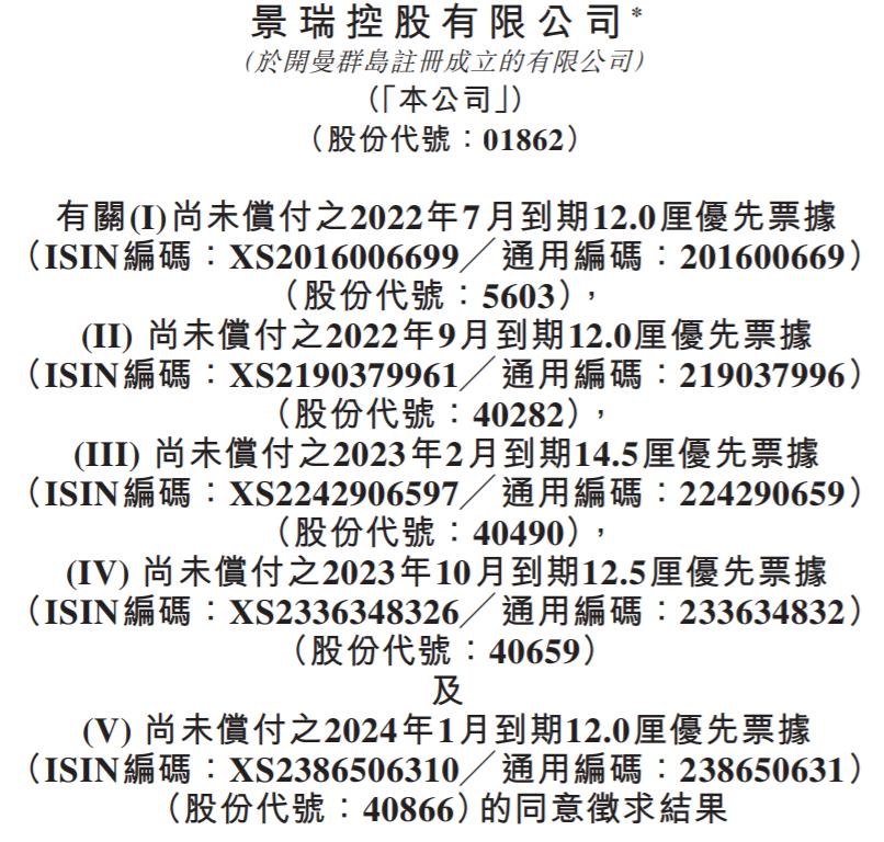 一周前的3月2日,景瑞控股还发布了5笔尚未偿付优先票据交换要约征求结果公告称,已获得必要同意以落实对各契约进行建议修订。
