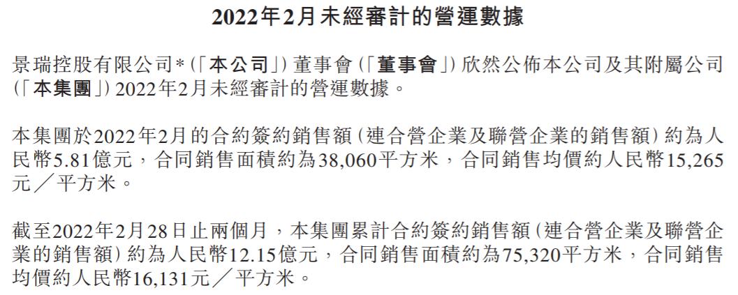 进入2022年,景瑞控股仍然面临较为严峻地的市场环境。公告显示,2022年1-2月,景瑞控股累计合约签约销售额(连合营企业及联营企业的销售额)约12.15亿元,同比减少约68.67%。