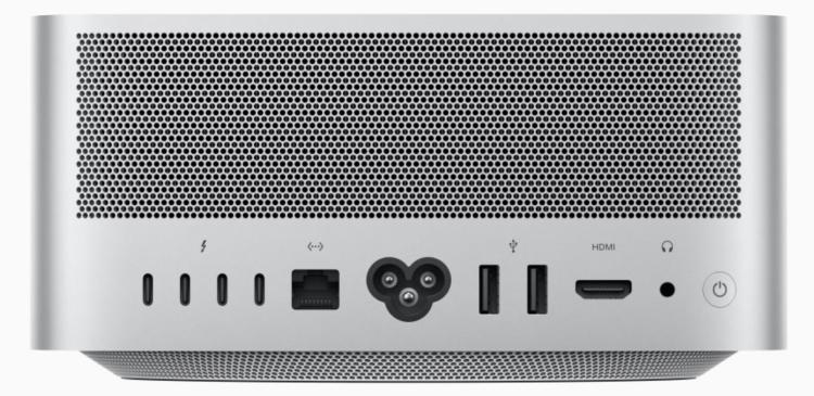 官方称:“Mac Studio 采用了创新的散热设计,能够实现非凡的散热表现。双离心风扇、精确放置的风道以及外壳背部和底部上的逾 4,000 个散热孔,共同构成了独特的散热系统,能够引导气流流经内部元件,帮助高性能芯片降温。”