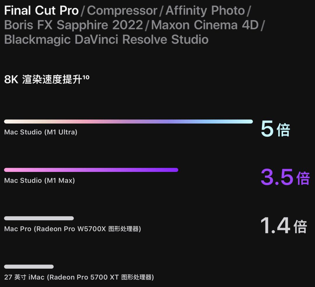 相比27英寸iMac中的AMD Radeon Pro 5700XT独立显卡,M1 Ultra的GPU性能提升高达4.5倍,甚至比起Mac Pro中的AMD Radeon Pro W6900X,性能提升幅度也达到了80%。下图是苹果关于8K渲染速度提升情况的测试结果。