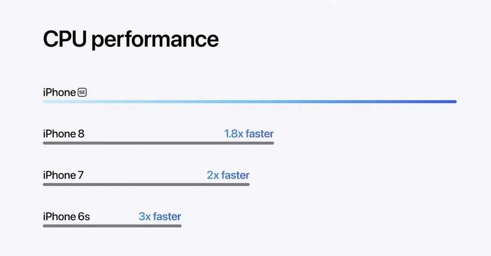 同时,新款iPhone SE用上和iPhone 13系列同款的A15仿生芯片,有6核CPU和4核GPU,CPU性能比iPhone 8提升1.8倍,GPU处理速度比二代SE最高提升1.2倍,神经网络处理能力提升26倍。