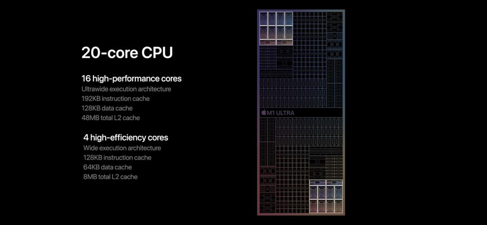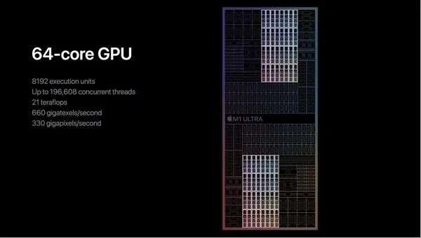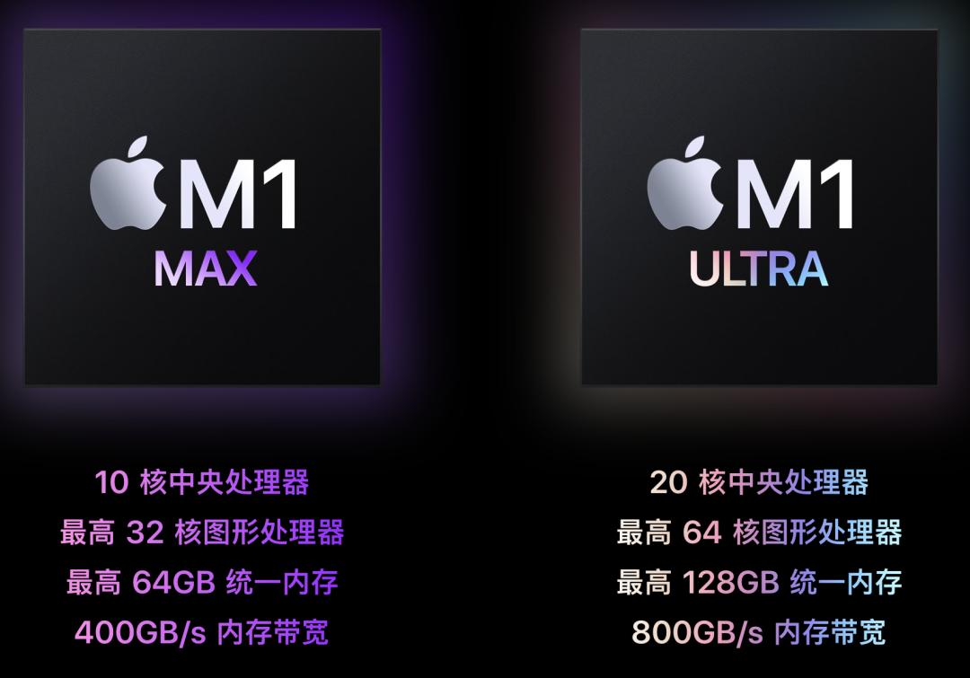 该芯片的各项硬件指标也翻番:20核CPU包含16个高性能核心、4个高能效核心;GPU核心数量增至64核;32核神经网络引擎能够带来每秒22万亿次的运算能力;统一内存最高规格达到128GB;内存带宽提升至800GB/s,达到最新型号台式PC芯片的10倍以上。同时,M1 Ultra最高支持8TB的SSD固态硬盘存储。