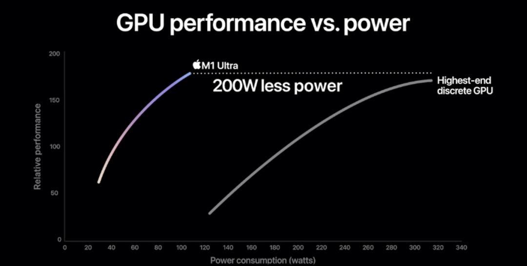 苹果声称实现同样的性能,M1 Ultra的功耗只有主流独立GPU的1/3,或比最强显卡英伟达GeForce RTX 3090少200W。