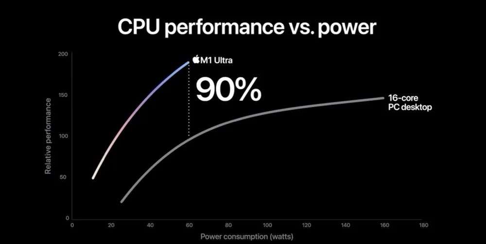 根据苹果提供的数据,在相同功耗下,M1 Ultra处理多线程任务的速度比16核英特尔旗舰至强i9-12900K提升了90%;实现同样性能时,M1 Ultra的功耗比12900K少100W。