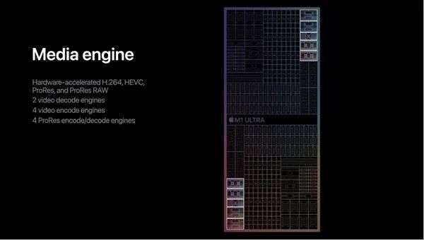 M1 Ultra的媒体处理引擎资源同样翻倍,其处理 ProRes格式视频编解码任务的吞吐能力提升至史上最高,最多可同时播放18条8K ProRes 422格式的视频流。
