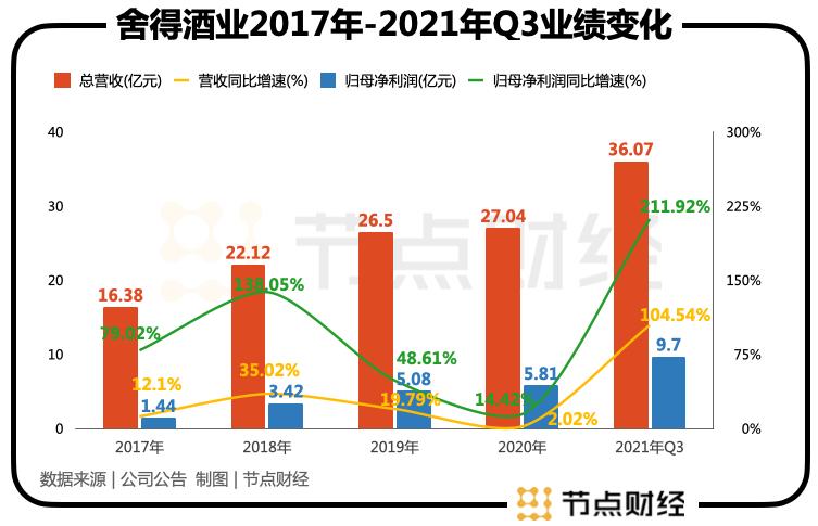 虽然一度被ST,但总体上看,最近几年舍得酒业的业绩并没有拉胯。而且在复星集团接手之后,进入2021年,其业绩可以用突飞猛进来形容。