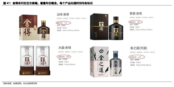 据舍得酒业自己介绍,公司目前拥有优质老酒窖藏达12万吨,自制半成品酒账面价值占总资产比例处于行业前列。其舍得系列也非常强调“年份酒”这一标识,提出老窖池、老曲艺、老酿艺、老酒糟、老匠人、老基酒等“六老”概念,不断强化舍得系列与老酒概念。